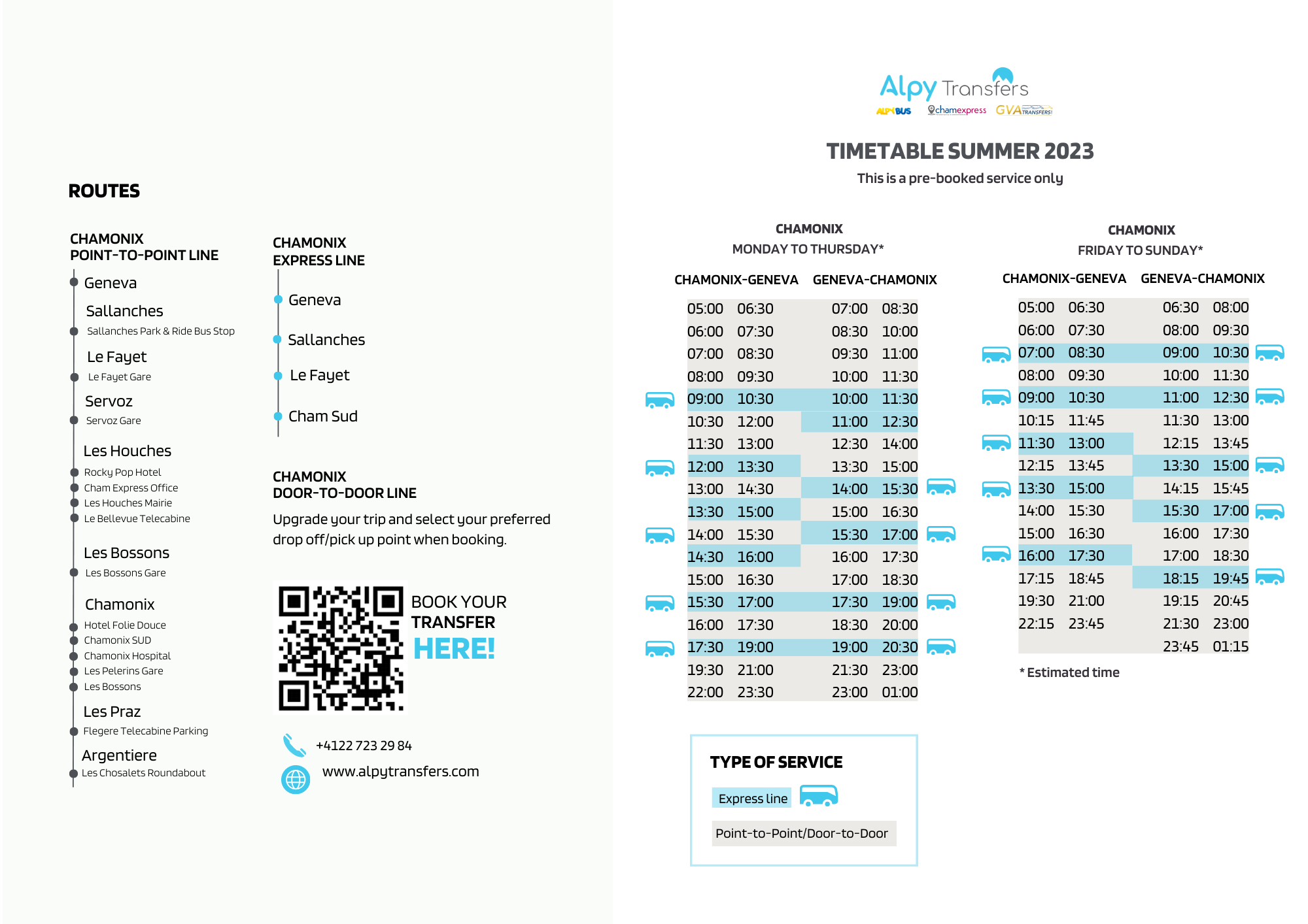 Notre ligne express est notre service le plus économique, fonctionnant aux heures de pointe. Elle circule à Chamonix et Morzine durant l'été. Nous vous déposerons et récupérons depuis des points specifiques.